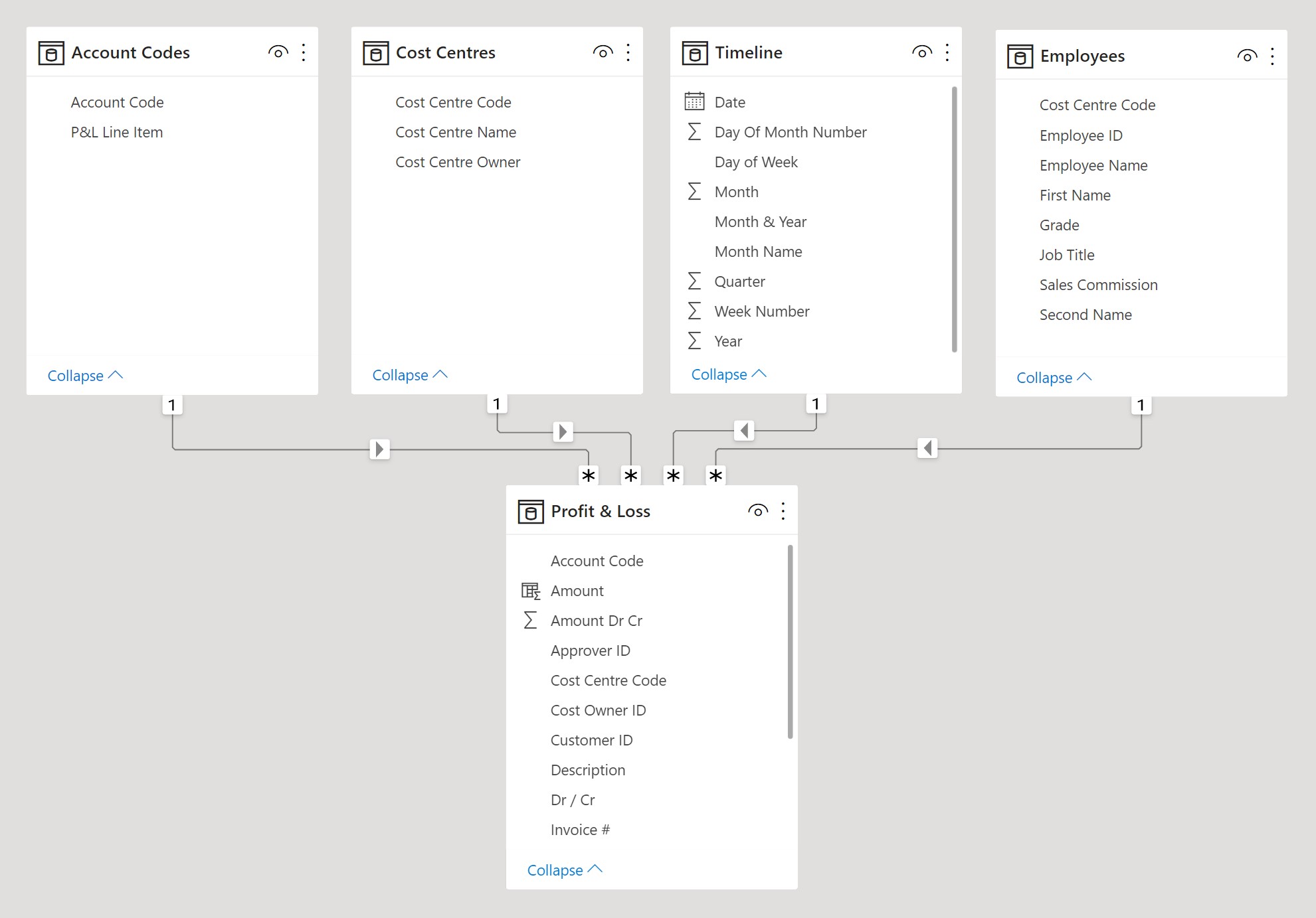 Power BI and Power Pivot change this. Instead of stitching everything together into one big Frankenstein’s monster, you load each dataset into its own table, then define relationships between them – for example, connecting transactions to your chart of accounts via account code, or linking cost centres to departments via a shared key. In doing so, you create a data model.