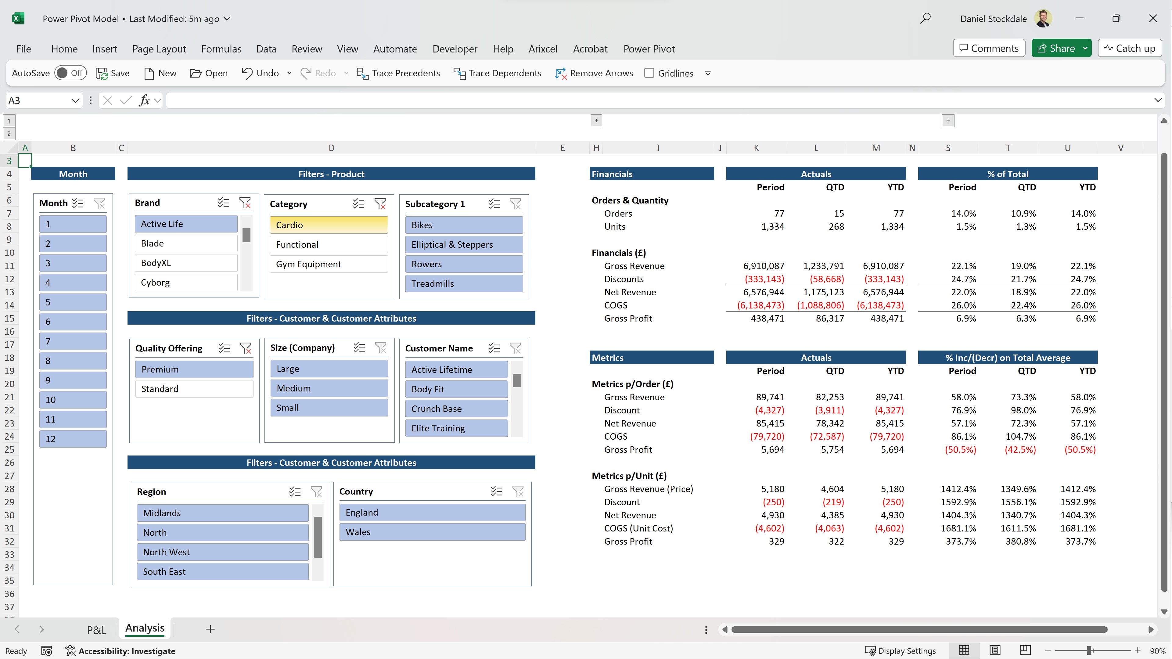Alternatively, you could create detailed dashboards such as the above that aggregate units, revenue, and COGS from the data model, and then produce simple neighbouring calculations that determine profit and metrics per unit. Any number of slicers could be included to filter the data model in a multitude of ways, and conditional formatting or charts added where required. The look and feel are fully customisable, and you can keep everything within the Excel environment your team already knows.